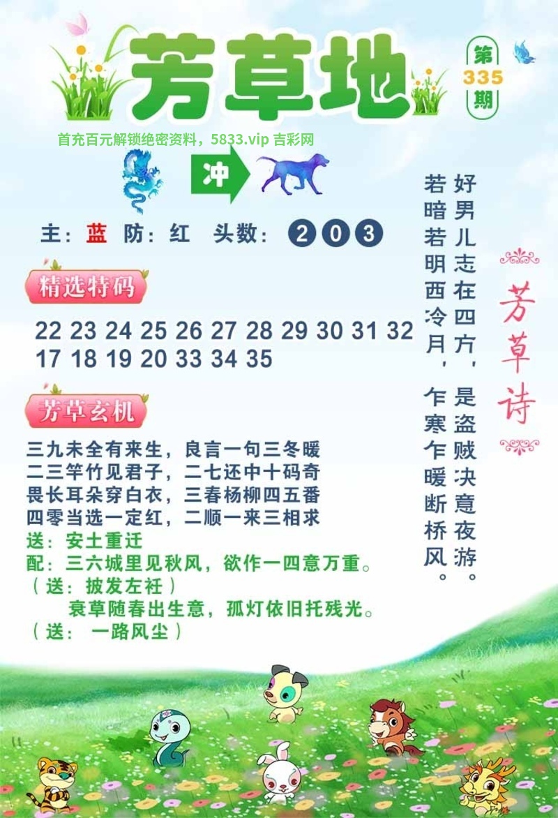 336期:【芳草玄机】:大财进出赚钱快,八九二七重复买。辞旧岁一出猴红,迎新年鸡飞枝头。蛇鼠一窝洞冲天,哼哈二将显神通。素心触拔自成丝,解读关赘不问师 芳草诗:三零四六为正码,二八橫空二点四。啸一声心惊胆跳,龙前牛后中间二 传奇特肖:牛虎鸡鼠蛇马龙 内幕头数:124 |